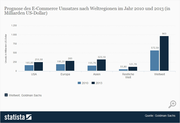 Laut Prognose lag der E-Commerce-Umsatz im Jahr 2010 bei weltweit 572,5 Milliarden US-Dollar.
