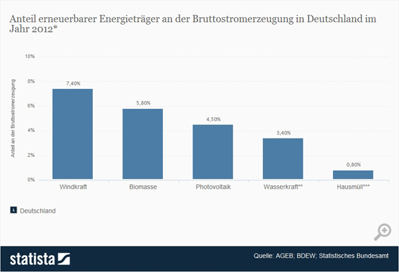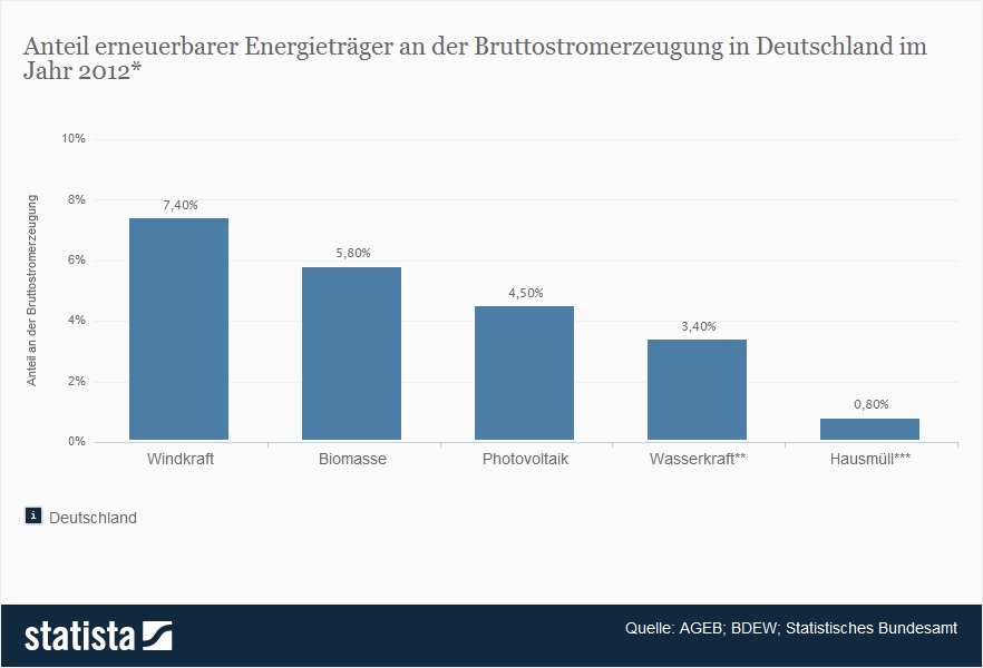 Die Statistik zeigt den Anteil erneuerbarer Energieträger an der Bruttostromerzeugung in Deutschland im Jahr 2012. Im Jahr 2012 wurden rund 7 Prozent der gesamten Bruttostromerzeugung in Deutschland von Windkraftanlagen produziert. Insgesamt lag der Anteil aller erneuerbaren Energieträger an der Bruttostromerzeugung in Deutschland im Jahr 2012 bei rund 22 Prozent.