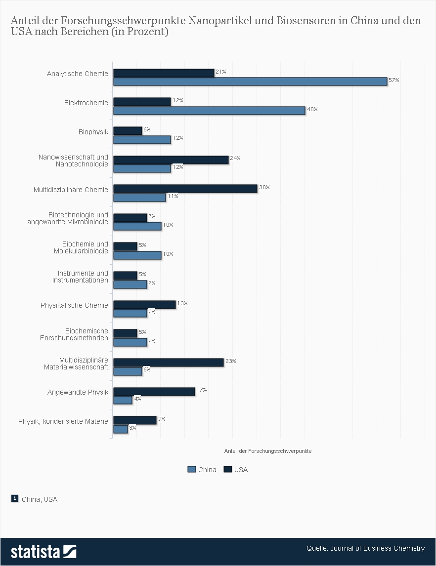 Amount of key research areas of nanoparticles and bio-sensors in China and the USA depending on areas (in percent)