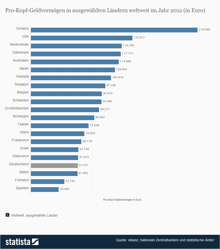 Weltweit sind die Menschen heute reicher denn je. Das Brutto-Geldvermögen der Deutschen befand sich mit EUR 4.939 Milliarden in 2012 auf Rekordniveau.Dies ist ein Plus von 4,9 Prozent im Vergleich zum Vorjahr. Weltweit konnte ein Zuwachs von 8,1 Prozent generiert werden. Das Vermögen der privaten Haushalte umfasst Aktien, Bargeld oder Bankeinlagen.