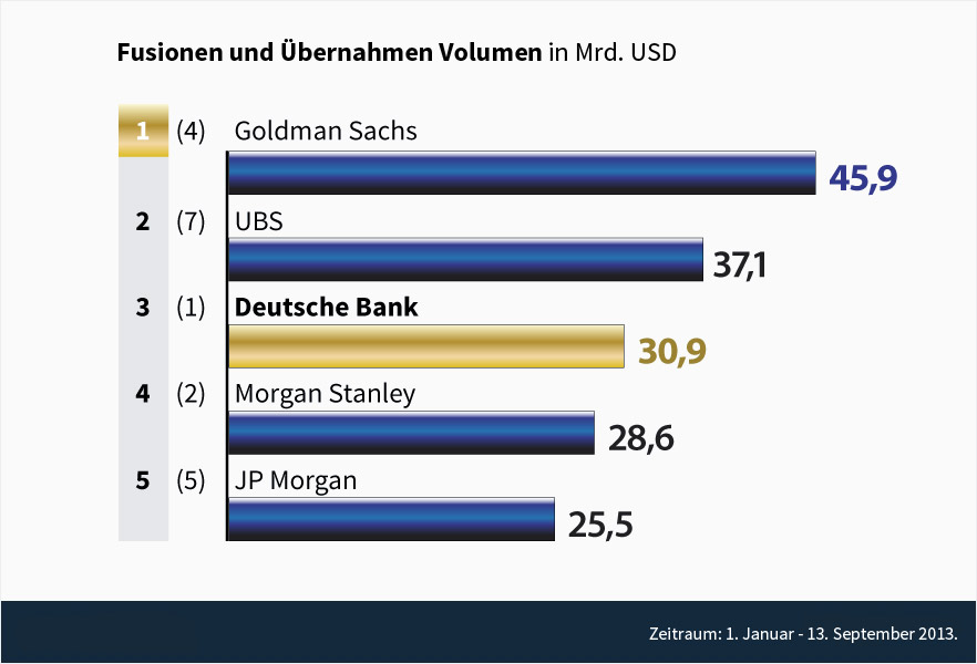 Doch nun löst Goldman Sachs die Deutsche Bank ab und erlangt die Top Position im Geschäft mit Fusionen und Übernahmen (M&A) für die ersten drei Quartale in 2013: 15 Deals im Wert von USD 45,9 Milliarden bescheren der US Bank den Spitzenplatz in Deutschland.