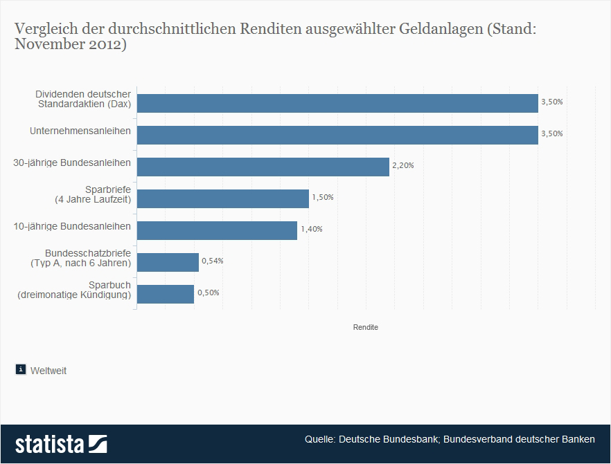 Die Statistik zeigt einen Vergleich der durchschnittlichen Renditen ausgewählter Geldanlagen per Stand November 2012. Anleger, die eine höhere Rendite wünschen, müssen aufgrund des zum Zeitpunkt der Erhebung vorherrschenden Niedrigzinsumfelds bereit sein, gewisse Risiken in Kauf zu nehmen. So bieten beispielsweise Unternehmensanleihen eine deutlich höhere Verzinsung, allerdings verbunden mit einem Emittentenrisiko – also der Gefahr, dass der Schuldner einer Anleihe später nicht in der Lage sein könnte, diese zurückzuzahlen.