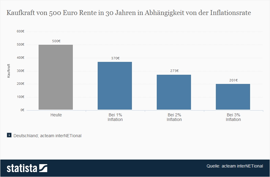 Die Statistik zeigt die Kaufkraft von 500 Euro Rente in 30 Jahren in Abhängigkeit von der Inflationsrate. Bei einer Inflationsrate von 3 Prozent hätten 500 Euro Rente in 30 Jahren eine Kaufkraft von 201 Euro.