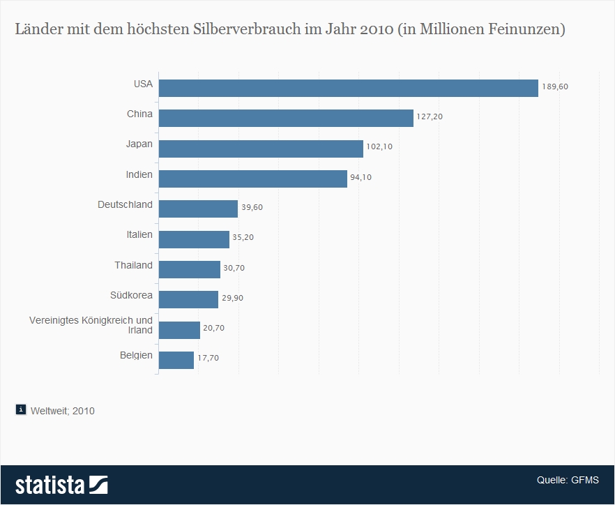 Die Statistik zeigt die Länder mit dem höchsten Silberverbrauch im Jahr 2010. Belgien verbrauchte in diesem Jahr rund 17,7 Millionen Feinunzen Silber. Der weltweite Verbrauch an Silber lag 2010 bei rund 879 Millionen Feinunzen.